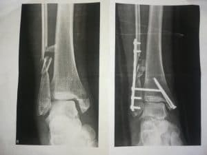 In de figuur 3 zien jullie 2 uitgeprinte röntgenfoto’s. De linker opname is gemaakt vóór de operatie en de rechteropname na de operatie. Beide foto’s laten de voorzijde van mijn rechter enkel zien.