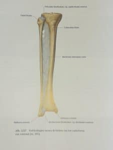 Mijn binnenste enkelknokkeltje (rechts op de foto – uiteinde van mijn scheenbeen) is met een schroef weer vastgezet aan mijn scheenbeen. Met een plaat en schroeven heeft de chirurg mijn kuitbeen proberen te repareren. En verder is er nog een lange horizontale schroef geplaatst om mijn kuitbeen aan mijn scheenbeen te fixeren. Dit is ter ondersteuning van het herstel van de zogenaamde syndesmose. Een syndesmose is een verbinding van beenderen door sterk bandweefsel (ligamenten). Deze banden maken dat er een sterke vork ontstaat waar de voet in opgesloten wordt en in kan scharnieren. Deze banden zijn niet in beeld te brengen op een röntgenfoto. Toch weten we dat de syndesmose beschadigd is omdat mijn voet zich tijdens de val heeft kunnen verplaatsen naar de buitenzijde van mijn onderbeen (zie figuur 2 en 3 in mijn verhaal van 28 december).